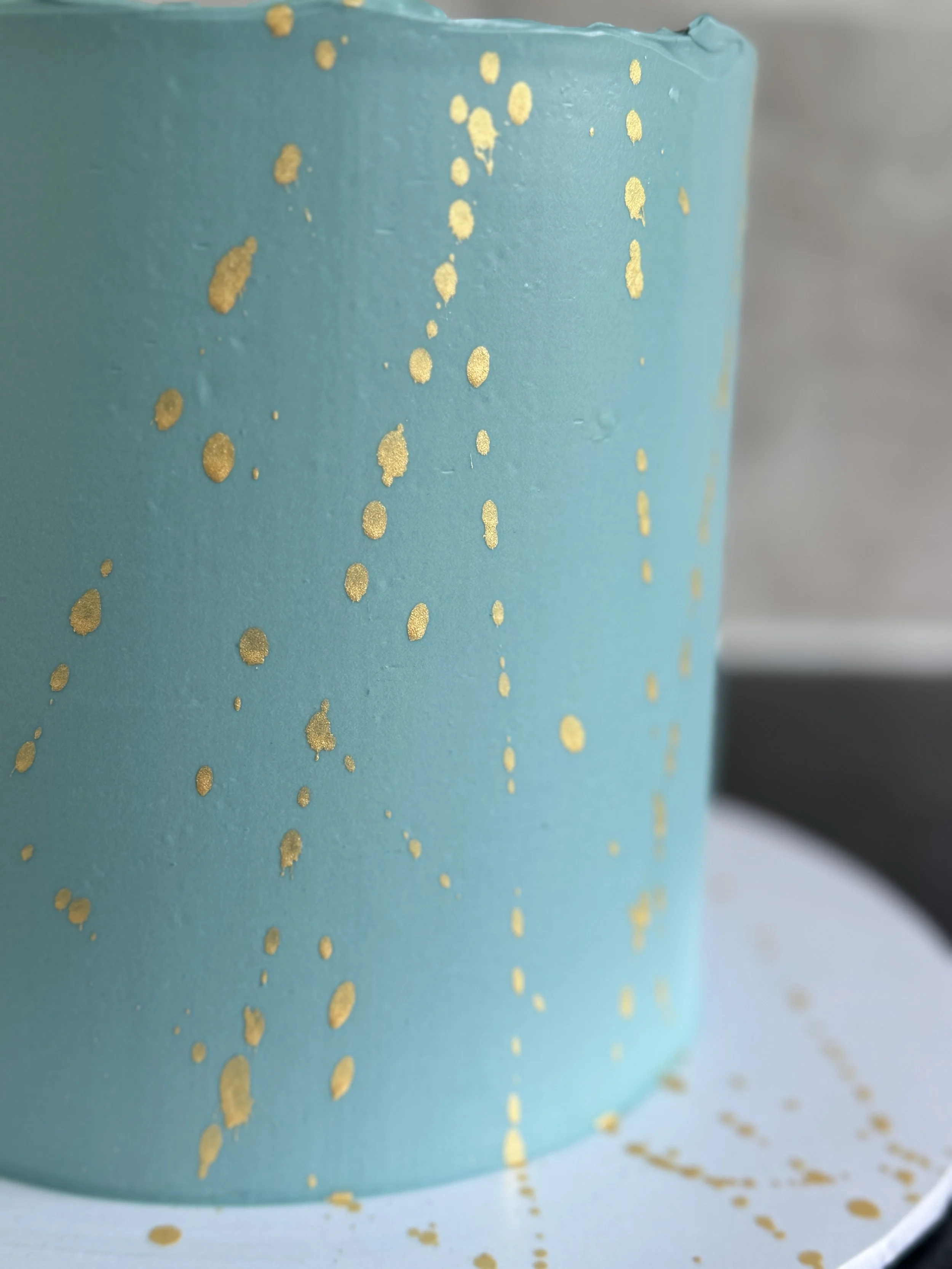 4 layers of moist sponge, layered with silky buttercream and a choice of filling to add a zing of flavour. Covered in a smooth layer of buttercream, with lustre dust splatter in a colour of your choice.